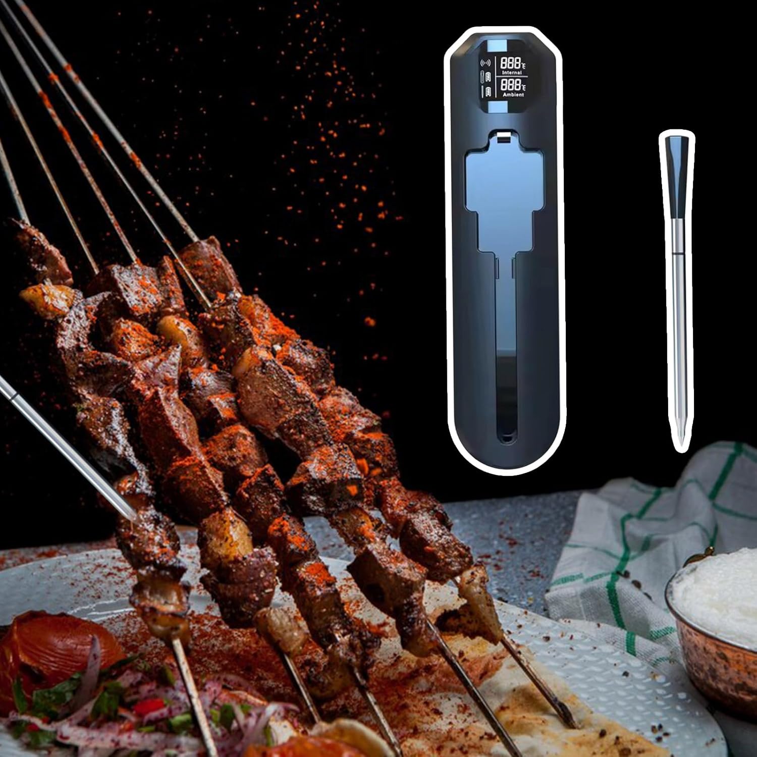 Long Ranges Wire-less Meat Thermometers With Smartphone Apps Meat Probe For Grilling And BakingFeatures:Accuracy Wire-less Meat thermometers with ±1℃ accuracy ensures perfectly cooked BBQ, feature connectivities up to 150m for realtime monitor via apps.Crafted with 572°F heatproof probes and IP67 water-proof rating, this digital thermometers withstands intense grilling projects while being dishwasher safe for easily-cleaning.Ideal for professional cooks, outdoors enthusiasts, and busy food truck operators seek efficient temperature control during mobile cooking operations.Professional backyard barbecues, smoker, and oven roasting with customizable alarms for 9 meat type and quick temperature tracking through wall via signals relays.Streamlines your cooking workflows with apps supported multilingual interfaces and cable release design, eliminating mess while monitor multiple dishes simultaneously during large gatherings.Specifications:Materials: Ceramics + 304 Nonrust Steel + AbsCharging Box Size: Approx.180x44.5x19mm/7.09x1.75x0.74inchesProbe Size:Approx.127.50x5.8x3.3±0.3mm/5.02x0.22x0.12±0.0.1inchesPackage Includes:1Pc Digital Food thermometersNote:Please allow 1-2cm error due to manual measurement. Please make sure you do not mind before you bid.Due to the differences between different monitors, the picture may not reflect the actual color. Thanks!